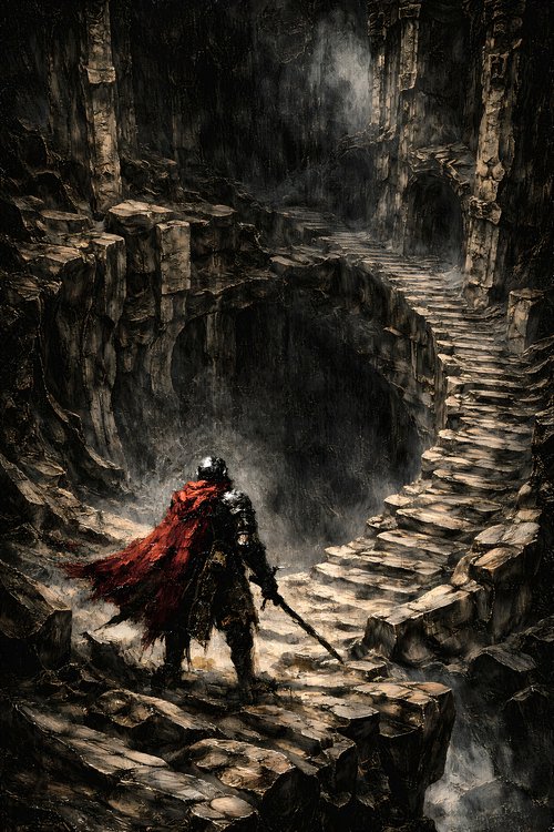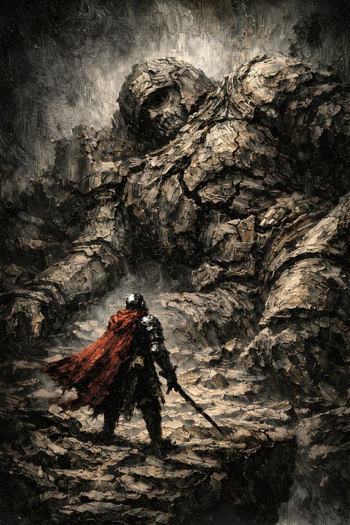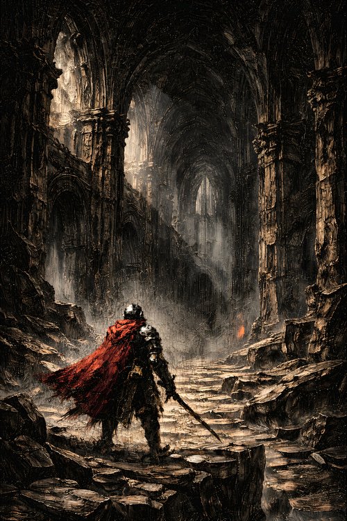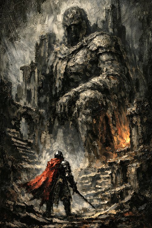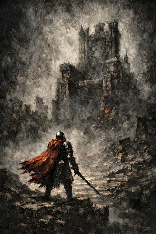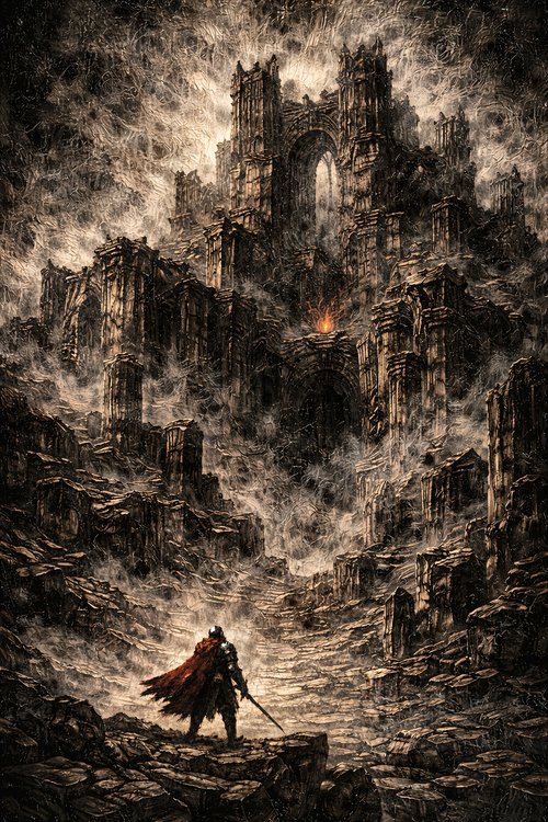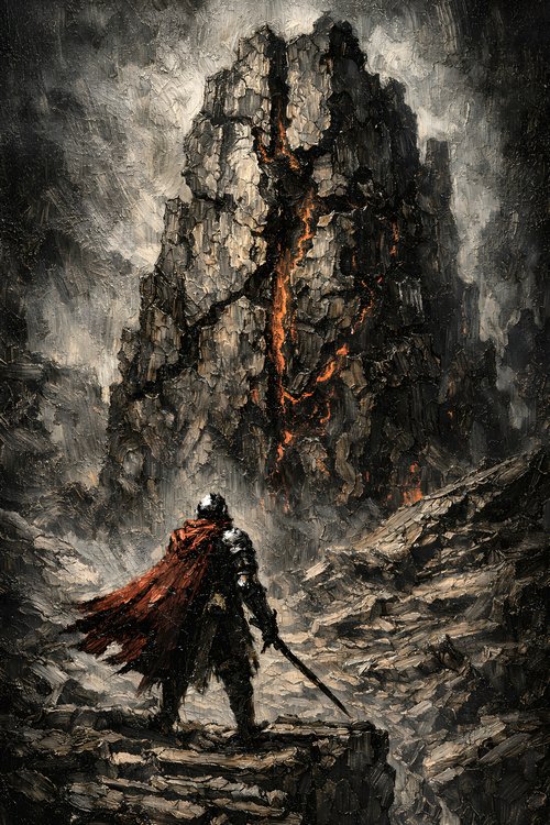 Obsidian Dusk Studio focuses on dark fantasy oil-style works inspired by monumental architecture and forgotten civilizations. Each piece emphasizes heavy impasto texture, dramatic chiaroscuro lighting, and carefully controlled tonal depth to create powerful vertical compositions suitable for large-scale wall display.