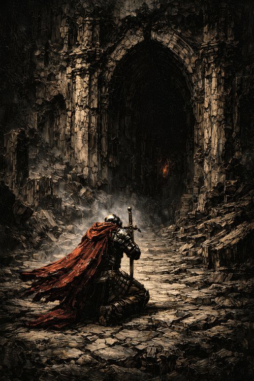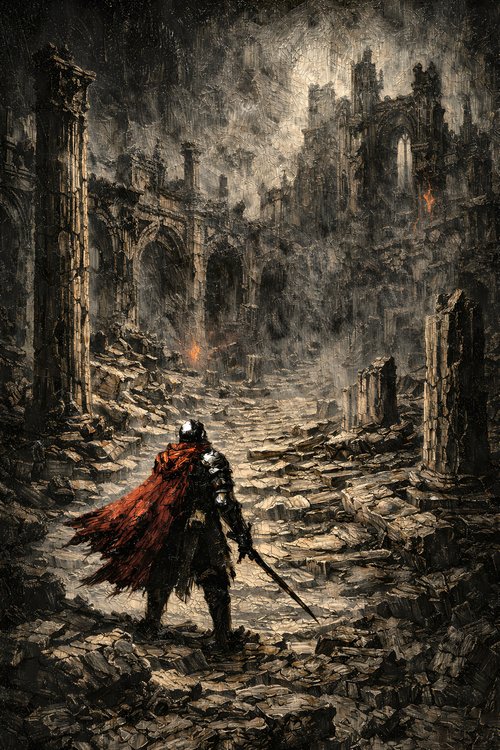 Obsidian Dusk Studio explores themes of monumental decay, forgotten kingdoms, and solitary resilience. The recurring knight figure serves as a scale anchor against vast architectural ruins, reinforcing a sense of isolation and epic weight.